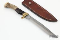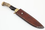 This XL Camp Knife by Ed Fowler features a drop point blade with convex ground bevels, .248" blade stock and 1.228" blade depth, hidden tang construction. The handle has an engraved brass guard, crown stag and ironwood grip with black/red/nickel silver spacers. Comes with original brown leather sheath and a zippered case. Has a few light scratches, otherwise excellent condition.