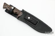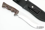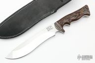 This Bush Hog by Walter Brend features a mirror finished blade with satin finished flats, .288" blade thickness and 1.677" blade depth, full tang construction. The handle has camo canvas micarta scales.  Includes a black leather sheath by Byrd's Leather. New from maker at the 2022 Blade Show.