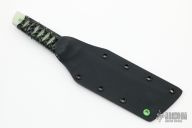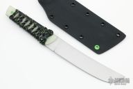 This Kwaiken by CF Knives features a satin finished blade with .128" blade stock and 1.19" blade depth, full tang construction. The handle has a purple/green ito wrap over glow in the dark jade scales, with Turks head knot guard, and toxic g10 pins. Comes with kydex sheath. New from maker at the 2022 Blade Show.