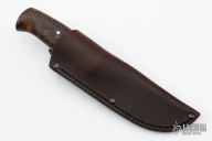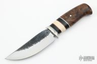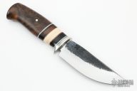 This Hunter by James Behring features a satin finished and hammer marked blade with false top edge, .174" blade stock and 1.473" blade depth, hidden tang construction. The handle has a onickel silver guard, turkish walnut grip and black/aluminum/white/turkish walnut/copper/mammoth ivory spacers. Comes with a brown leather sheath by Warlander Leather. New from maker at the 2022 Blade Show. Comes with a zippered case.