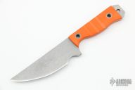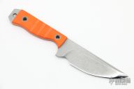 This RBC by Jeremy Horton features a tumbled chisel ground blade with swedge, .134" blade stock and 1.127" blade depth, full tang construction. The handle has fluted orange G10 scales with flanged tub pins. Comes with original tube from Jeremy. New from maker!