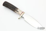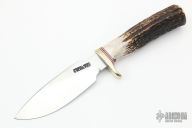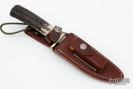 The Model 11 is the original drop-point blade. Designed by Tommy Thompson, noted Alaskan guide, in 1952 for big-game skinning, with point dropped below top of blade to prevent cutting too deeply through skins when used point first. The blade is satin finished with a notched thumbrest, .204" blade stock and 1.419" blade depth, hidden tang construction. The handle has a brass guard, stag handle, red/white/blue spacers, compass in the butt. Comes with a brown leather sheath with sharpening stone. New from maker.