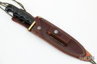 This Model 14 by Randall Made Knives features a satin finished blade with sharpened top edge, .212" blade stock. 1.410" blade depth, full tang construction. The handle has a brass guard, black linen micarta handle with a lanyard hole at the butt. This knife was designed to meet the demand for an almost indestructible all-purpose knife, though it is especially suited for combat and survival purposes. Comes with brown leather sheath.  New from maker.