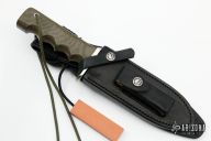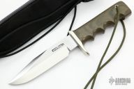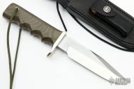 This Model 15 Airman by Randall Made Knives features a clip point blade with a sharpened top edge, .224" stock. 1.261" blade depth, full tang construction. The handle has green linen micarta handle with finger grips and a nickel silver guard. The Model 15 is designed especially for heavy-duty use and to be as nearly indestructible as possible. Comes with a black leather sheath. Comes with original paper wrapping. New from maker.