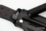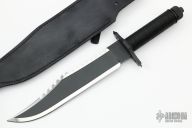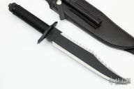 This knife features a two-tone blade with black center and mirror polished grinds, 14 saw-teeth on blade spine and sharpened top edge, .258" blade stock and 1.825" blade depth, hidden tang construction. The handle has a black stainless steel double guard with flat and Phillips head screwdrivers, hollow cord wrapped handle, and aluminum removable butt cap with a compass and an O-ring to make it waterproof. Comes with black leather sheath with a diamond sharpener in the sheath and a Lile zippered case. The blade is stamped 057. Designed by Jimmy Lile and made by Vaughn Neeley. New From Maker!