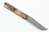 This linerlock front flipper from Brad Zinker features a Mike Norris Fireclone Damascus blade with checkered thumbrest and front tlipper. The handle has mammoth ivory scales, anodized titanium liners with laser engraved jeweled interiors, stonewashed and anodized tip up clip. Nice detent, lockup and blade seating, rides on bearings. Includes a padded zippered case. New from maker at the 2022 Blade Show.
