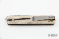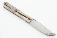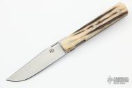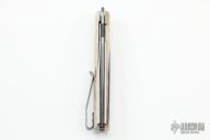 This linerlock front flipper from Brad Zinker features a stonewashed blade with checkered thumbrest and front tlipper. The handle has stag scales, satin titanium liners with laser engraved jeweled interiors, stonewashed tip up clip. Nice detent, lockup and blade seating, rides on bearings. Includes a padded zippered case. New from maker at the 2022 Blade Show.