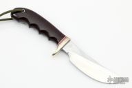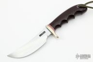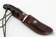 This Model 20 Ward Gay Special (non-catalog model) features a satin finished upswept carbon steel blade with notched thumbrest, .214" blade stock and 1.095" blade depth, hidden tang construction. The handle has a nickel silver guard, maroon linen micarta grip, red/white/black spacers and a lanyard hole at the butt. Comes with brown leather sheath. Excellent Condition.
