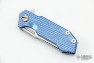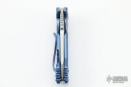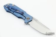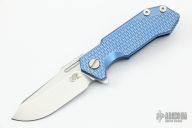 This Half Track from Hinderer Knives features a stonewash finished blade with swedge, fullers, notched thumbrest and flipper. The handle is comprised of a tumbled and anodized titanium frame over barrel spacers. Titanium clip is positioned for tip up, right hand carry. Includes a Hinderer box.  Excellent Condition.