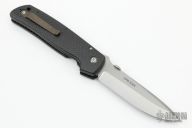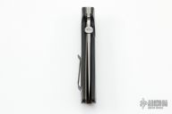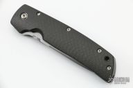 This ATCF linerlock folder by Bob Terzuola features a spear point blade with notched thumbrest and thumb disc. The handle has carbon fiber scales, a bead blasted and anodized single titanium liner, black linen micarta backspacer, and tip up bead blasted and anodized titanium clip. Smooth action. Nice lockup, detent and seating. Excellent condition. Comes with a zippered case.