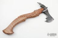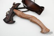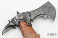 This Battle Hawk by the Sobral Brothers features a Damascus blade head with spike at the rear, gold inlaid engraving, Damascus cap and spike on top, 8" from blade to spike. The handle is a piece of beautifully contoured curly maple. Comes with an equally spectacular hand tooled leather sheath with shoulder rig. Comes with a zippered case. New from maker at the 2022 Blade Show.