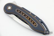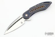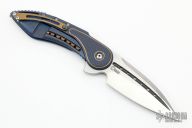 This Glimpse 5.5 from Todd Begg features a satin finished blade with false top edge and cracked ice finish on blade spine and flipper. The handle is comprised of machined and anodized titanium scales with titanium tip down pocket clip and machined titanium backspacer. Great blade seating, detent and lock up. Features Ceramic IKBS. Includes zippered case. Excellent condition.