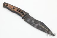 This Intruder by TASKnives features an acid etch finished upswept clip point blade with a notched thumbrest, .202" blade stock and 1.403" blade depth, full tang construction. The handle has copper and g10 scales with black hardware. Comes with leather sheath. 61-62HRC. New from maker at the 2022 Blade Show!