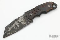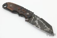 This Invaderling by TASKnives features an acid etch finished multi-ground clip point blade with a notched thumbrest, .236" blade stock and 1.3" blade depth, full tang construction. The handle has copper and g10 scales with stainless hardware. Comes with leather sheath. 61-62HRC. New from maker at the 2022 Blade Show!