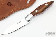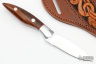 This knife by Eddie Ray features a mirror polished blade with .113" blade stock and .864" blade depth, full tang construction. The handle has mirror polished stainless steel bolsters, vintage Westinghouse canvas micarta scales with red liners and stainless steel pins. Comes with a hand tooled brown leather cross draw sheath. New from maker at the 2022 Blade Show.