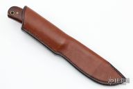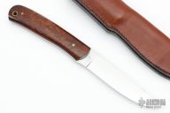 This fixed blade by Master Smith Joshua Smith features a mirror polished blade with filework on the spine near the tip, .132" blade stock and .873" blade depth, full tapered tang construction. The handle has desert ironwood scales with mosaic pins and black liners. Comes with a brown leather sheath. Has a few light oxidation spots, othewise excellent condition.
