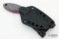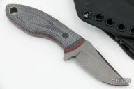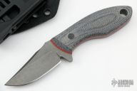 This Tusk by Tom Krein features an acid washed blade with .138" blade stock and 1.045" blade depth, full tang construction. The handle has blue canvas micarta scales with red liners, aluminum lanyard tube and black pin. Includes Kydex sheath with TekLok. New from maker at the 2022 Blade Show.