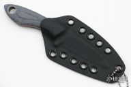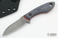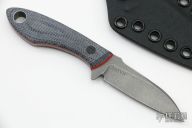 This TK-1 Wharnie XL by Tom Krein features an acid washed blade with .095" blade stock and .775" blade depth, full tang construction. The handle has blue canvas micarta scales with black liners and pin and aluminum lanyard tube. Includes Kydex neck sheath with ball chain. New from maker at the 2022 Blade Show.