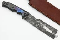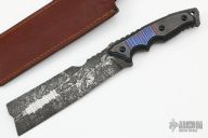 This Debris by TASKnives features an acid etched blade with a notched thumbrest, .223" blade stock and 1.680" blade depth, full tang construction. The handle has anodized titanium over black G-10 scales with black hardware. Comes with a brown leather sheath. 61-62HRC. New from maker at the 2022 Blade Show!