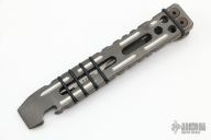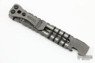 This prybar by Tim Miller is made from 6AL4V Titanium, it is .275" thick, has rubber o-rings holding in a phillips/flathead bit and a 1/4" hex driver for the bit, bottle opener, has lanyard holes and a titanium clip. Comes with COA. New from maker at the 2022 Blade Show.