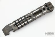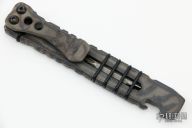 This prybar by Tim Miller is made from 6AL4V Titanium, it is .275" thick, has rubber o-rings holding in a phillips/flathead bit and a 1/4" hex driver for the bit, bottle opener, has lanyard holes and a titanium clip. Comes with COA. New from maker at the 2022 Blade Show.