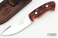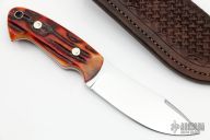 This Smoke Jumper by Jim Martindale features sambar stag scales with red liners and a full tapered tang construction with .155" blade stock and 1.097" blade depth. Mirror polished blade. Includes a hand tooled brown leather sheath with belt loop and COA. #200 on blade. New from Maker at the 2022 Blade Show.
