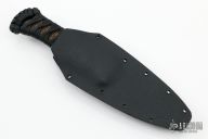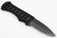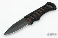 This Blood Shark by Tracker Dan features a black (with green hue) finished blade with a false top edge, frogman grind, .150" blade stock and 1" blade depth. The handle has black cord wrap over hemp wrap. Comes with a 3/4 kydex sheath and the knife will fit in either direction. Excellent condition.