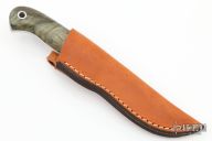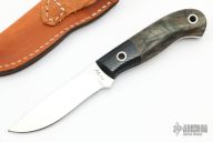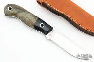 This hunter by Mike Irie features a hand rubbed satin finish blade with notched thumbrest, .123" blade stock and .875" blade depth, full tang construction. The handle has black linen micarta dovetailed bolsters and maple burl scales. Excellent fit and finish. Brown leather sheath. New from maker at the 2022 Blade Show.