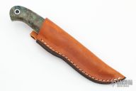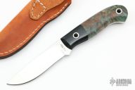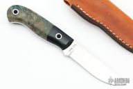 This hunter by Mike Irie features a hand rubbed satin finish blade with notched thumbrest, .123" blade stock and .875" blade depth, full tang construction. The handle has black linen micarta dovetailed bolsters and maple burl scales. Excellent fit and finish. Brown leather sheath. New from maker at the 2022 Blade Show.