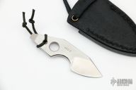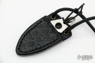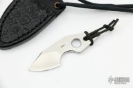 This neck knife by Mickey Yurco features a satin finished blade with a notched thumbrest, .129" blade stock and .851" blade depth, full tang construction. Comes with a black leather neck sheath. New from maker at the 2022 Blade Show.