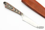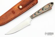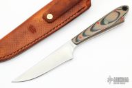 This knife by Mickey Yurco features a satin finished blade with notched thumbrest, .135" blade stock and .985" blade depth, full tang construction. The handle has green/black G-10 scales with orange and GITD pins and a lanyard hole. Comes with a brown leather sheath. New from maker at the 2022 Blade Show.