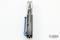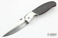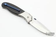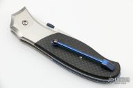 This Rush linerlock folder by Sal Manaro features a hand rub satin finished spear point blade with false top edge, checkered and anodized titanium thumbdisc and notched thumbrest. The handle has polished titanium bolsters, carbon fiber scales, satin titanium liners, and an anodized and checkered titanium backspacer, has anodized titanium clip, tip up carry. Perfect blade seating, detent and lockup. Excellent work from Mr. Manaro. Has some light scratches, otherwise excellent condition. Comes with a zippered case.