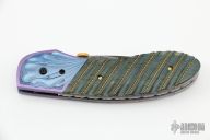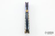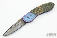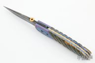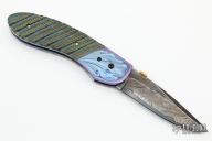 This custom linerlock by Jim and Joyce Minnick features a blued Damascus blade with false top edge and a gold thumbdisc. The handle has carved and anodized titanium bolsters, fluted mammoth ivory scales with twisted gold wire inlays, gold screws, anodized titanium liners, fileworked mammoth ivory backspacer. Nice detent, blade seating and lockup. Beautiful materials. Outstanding work with great attention to detail. Excellent condition. Comes with a zippered case.