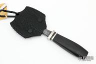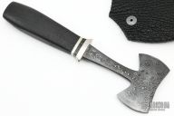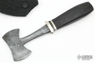 This Double Bit Mini Axe by Bil Ogden features an Alabama Damascus blade, .240" blade stock and has 1.625" blades, hidden tang construction. The handle has a nickel silver guard, 5460 year old bog oak grip and nickel silver and black turquoise spacers. Comes with a black camel leather dangler sheath. New from maker at the 2022 Blade Show. Comes with COA.