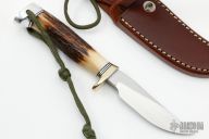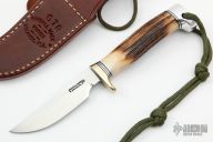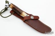 This GTR by Randall Made Knives features a satin finished blade with .163" blade stock and .833" blade depth, hidden tang construction. The handle has a brass guard and crows beak duralumin butt, stag grip and black/duralumin spacers. Knife comes with a brown leather sheath with belt loop and original papers. Excellent condition. This is a Non-Catalog model.