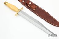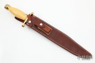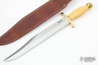 The 13" Randall Thorp Bowie by Randall Made Knives is similar to types used by Confederate troops. This one has an 13" carbon steel blade with sharpened top edge, .213" blade stock and 1.648" blade depth, hidden tang construction. The handle has a brass lugged guard and butt cap, and a yellow Westinghouse paper micarta grip with black spacers. Comes with a brown leather sheath and Randall zippered case. Excellent condition.
