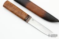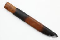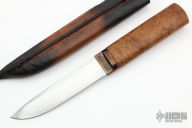This Java Kwaiken by Murad Custom Knives features a hand rub satin finished blade with nice hamon .109" blade stock and 1.078" blade depth, hidden tang construction. The handle has an antiqued brass guard and a teak burl wood grip. Comes with a brown leather sheath and COA. New from maker.