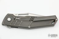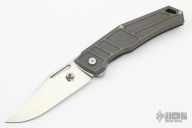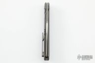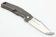 This Horseman by Kristal has a satin finish clip point blade with notched thumbramp, flipper tab, sedge and thumbhole. The handle has stone wash finish milled titanium scales with matching tip up clip, backspacer , and lanyard hole in pommel. Over-travel stop. Comes with original papers, zipper case and extra hardware/tools. Has some light scuffs and scratches, otherwise great condition.