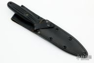 This Applegate-Fairbairn Combat Dagger (#07012) by Blackjack Knives has a bead blasted D/E spear point blade with hidden tang, .174" blade stock, 1.103" blade depth. Handle is non-slip black polymer with contoured grooves, brass guard, and lanyard hole. Includes original black leather sheath. Has a few light scuffs, otherwise excellent condition.