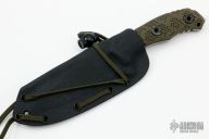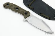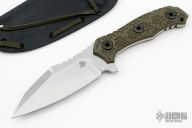 This Colubris by American Kami features a tumbled blade with notched thumbrest, .182" blade stock and 1.505" blade depth, full tang construction. Green G-10 milled scales. Comes with Kydex sheath. Excellent condition.