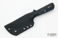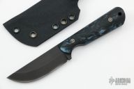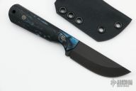 This knife by Joey Roman features a black blade with .148" blade stock and .948" blade depth, full tang construction. The handle has blue/black resin handles. Comes with a kydex sheath. Excellent condition.
