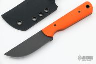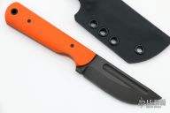This knife by Joey Roman features a black blade with .145" blade stock and .945" blade depth, full tang construction and fuller. The handle has orange g10 handles. Comes with a kydex sheath. Excellent condition.