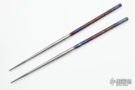 Feed yourself and your pride of ownership with these exquisitely crafted titanium chopsticks. Designed and engineered by world-renowned custom knifemaker Alan Folts and manufactured under the Foltsum™ brand, these chopsticks are beautifully crafted from solid 6AL 4V titanium stock. Their two-piece construction allows them to be conveniently carried when not in use, yet assembled in seconds thanks to a precision threaded joint. Machined in painstaking detail, they feature three different surface finishes, including a bead blasted area near the tip for a secure grip on food, a satin-finished center section, and a rich color-anodized handle section. Machined accents at the top and center add both a touch of style and a thoughtful grip texture that complements their perfect balance.Remarkably strong and lightweight, these elite eating utensils are also 100% corrosion resistant, completely food safe, hypoallergenic, and easily cleaned with ordinary soap and water. They come complete with a ballistic nylon carry pouch with dedicated pockets for all four pieces and a heavy-duty Velcro® closure.