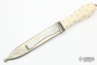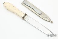This San Francisco Dirk by Steven J Rapp features a hand rub satin finished blade with false top edge, .174" blade stock and 1.104" blade depth, hidden tang construction. The handle has a nickel silver guard and a mammoth ivory grip with nickel silver studs. Comes with an engraved nickel silver scabbard engraved by S.M. Lytton. Excellent condition. Comes with a zippered case.