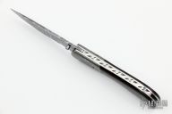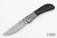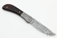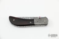 This liner lock folder by Master Smith Josh Smith features a Mosaic Damascus drop point blade with a single thumbstud with a ruby inlay.  The handle has Damascus dovetailed bolsters, desert ironwood burl scales, stainless steel liners, and a fileworked stainless steel backspacer. Nice detent, lockup and blade seating. Excellent condition.