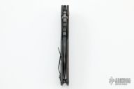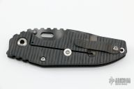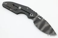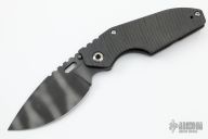This XL Jibble by Mick Strider features a tiger striped blade with notched thumbrest and a thumbhole. The handle has a flamed titanium frame with tip up reversible clip. Nice detent, lockup and blade seating. Has a couple light scuffs, otherwise excellent condition.