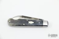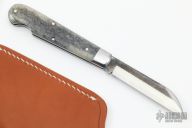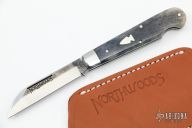 This knife from Northwoods Knives features a satin finished wharncliffe blade. The handle has stainless bolsters, liners and shield complimented by dyed camel bone covers. Includes a brown leather slip sheath. Excellent Condition.
