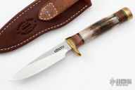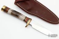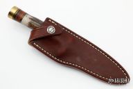 This Model 26 Pathfinder by Randall Made Knives is one of Randall's best-selling models. It features a drop point satin finished blade with .162" blade stock and .900" blade depth, hidden tang construction. The handle has a brass guard and butt, stag grip and black/brass/leather spacers. Comes with a brown leather sheath. Excellent condition.