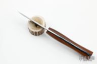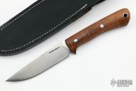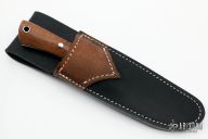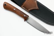 This Tucson by Lon Humphrey features a satin finished blade with .130" blade stock and 1.033" blade depth, full tang construction. The handle has Tasmanian wood scales with black liners and steel pins and lanyard tube. Comes with a brown/black leather sheath and original box. Excellent condition.