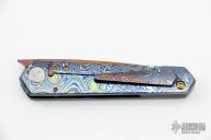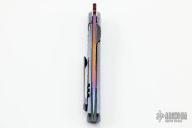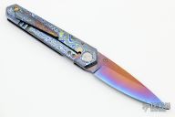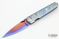 This icepick framelock front flipper from Sergey Rogovets features a heat colored blade with notched front flipper and a ZircuTi thumb lug. The blade is either SM100 or Titanium, honestly don't know, but it is not magnetic. The handle has a ZircuTi frame with a matching tip up pocket clip with hidden screws, zirconium backspacer. Custom pivot screw and anodized hardware. Nice detent, lockup and blade seating, rides on bearings. Locks up with no play, has a D2 lockface insert. Excellent condition. Dated 2012 inside backspacer.